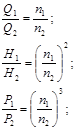 Изменение частоты вращения вентилятора приводит к изменению его характеристики, как это показано на рис. 2. Здесь кривые 2 и 3 соответствуют пониженной частоте вращения. Из рисунка видно, что снижение частоты вращения вентилятора приводит к перемещению рабочей точки вдоль характеристики системы и существенному снижению расхода электроэнергии при тех же расходах, что и на рис. 1. Количественную оценку этих изменений можно получить из формул, называемых законами подобия: