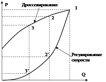 Аналогичные кривые можно построить и для центробежных насосов. Здесь изменение производительности обычно осуществляется дроссельными заслонками на выходе насоса. На рис. 3 представлен сравнительный график мощности, потребляемой насосом, в зависимости от расхода при регулировании дросселированием и частотном регулировании. Разность между значениями этими кривыми при заданном расходе позволяет определить экономию энергии при частотном регулировании по сравнению с регулированием дроссельной заслонкой.