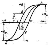 4) При изменении направления намагничивающего тока меняется и направление напряженности поля (участок БГ). При Н = Нс (точка Г), получим индукцию В = 0. Значение Нс называется коэрцитивной силой.