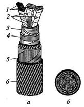Рис. 12.1. Кабель силовой с бумажной пропитанной изоляцией, бронированный: 6 - поперечный разрез четырехжильного кабеля; 1 - токоведущие жилы; 2, 3 - соответсвенно фазовая и поясная изоляции из пропитанной кабельной бумаги; 4 - оболочка алюминиевая или свинцовая; 5 - стальная ленточная броня; 6 - слой кабельной пряжи