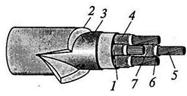Рис. 12..2. Шланговый кабель марки КРПТ: 1 — заземляющая жила; 2 — резиновая оболочка; 3 — прорезиненная ткань; 4 — изоляция жил; 5— медная токоведущая жила; б— вулканизационная резина; 7— обмотка тканевой лентой