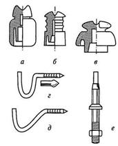 Рис. 12.3. Изоляторы и крюки: а - изолятор типа ТФ для ВЛ до I кВ; 6 - то же, типа ШО (для ответвлений); в-типа ШС для ВЛ 6...10кВ; г, д - крюки; е - штырь