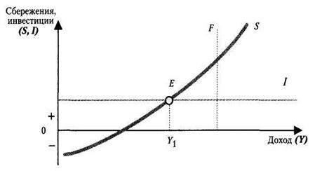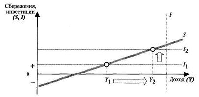 На оси абсцисс откладывается уровень дохода, на оси ординат – сбережения и инвестиции. Линия инвестиций в такой системе координат – горизонтальная линия, так как инвестиции не зависят от уровня дохода (они автономны от дохода). Линия сбережений строится в зависимости от дохода, ее наклон определяется предельной склонностью к сбережению. Равновесие между инвестициями и сбережениями установится в той точке, где их графики пересекаются, т.е. в точке Е. Размер дохода Y1 – это равновесный уровень дохода. Проблема заключается в том, что равновесный уровень дохода, даже если он достигнут, может не обеспечивать достижение уровня полной занятости (F).