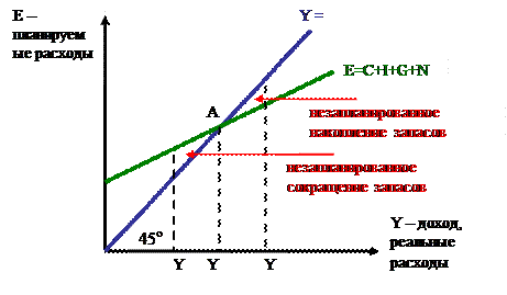 Если фактический объем производства Y1 превышает равновесный Y0, то это приведет к росту нереализованной продукции (товароматериальных запасов), снижению прибыли, сокращению объема производства и занятости. Если фактический выпуск производства Y2 меньше равновесного Y0, то происходит незапланированное сокращение инвестиций в товароматериальные запасы, рост прибыли, увеличение производства и занятости, т.е. достигается равновесие AD=AS.