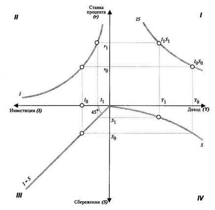Взаимосвязь сбережений, инвестиций, уровня процента и уровня дохода можно графически представить с помощью модели IS (инвестиции – сбережения) – рис. 19.14. Модель разработана в 1930-е гг. английским экономистом Дж. Хиксом. Она показывает равновесие на реальном рынке, т.е. на рынке товаров и услуг. Кривая IS проходит через точки, отражающие такое соотношение процентной ставки и дохода, при которых выполняется условие равновесия, т.е. сбережения равны инвестициям.