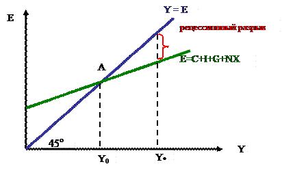 Рецессионный разрыв – величина, на которую должен возрасти совокупный спрос (совокупные расходы Е), чтобы повысить равновесный ВНП до неинфляционного уровня полной занятости.