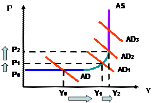 На графике видно, что кривая совокупного спроса смещается вправо на промежуточном и вертикальном участках, наблюдается рост общего уровня цен, который, однако, на промежуточном отрезке сопровождается ростом реального объема производства, т.е. инфляция спроса может быть положительным явлением, если только темпы роста цен сопоставимы с темпами роста производства. На вертикальном участке наблюдается инфляция без увеличения реального объема производства.