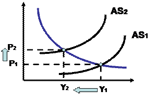 Если причины дисбаланса находятся на стороне совокупного предложения, то такая инфляция называется инфляцией предложения. Ее еще называют инфляцией издержек, инфляцией затрат, или стагфляцией. Графически инфляцию предложения можно представить так, как это показано на рис. 21.2. На графике видно, что кривая совокупного предложения смещается влево, и этот сдвиг вызывает рост цен при сокращении реального объема производства, т.е. инфляция предложения — явление сугубо отрицательное.