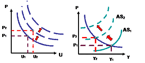 На рис.21.3 видно, что понижение уровня безработицы от U0 до U1 приводит к росту уровня цен от P0 до Р1.