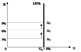 Итак, безработица всегда возвращается к исходному уровню, обозначенному на графике Un т.е. к естественному уровню безработицы. А кривая Филлипса в долгосрочном периоде приобретает вертикальный характер подобно тому, как и кривая совокупного предложения в долгосрочном периоде становится вертикальной линией.
