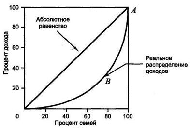Получение доходов сопровождается неравенством. Дифференциация доходов указывает на различия в уровнях доходов на душу населения. Для характеристики неравномерности распределения дохода общества между различными группами населения в экономической теории часто используется кривая Лоренца (рис. 27.2).