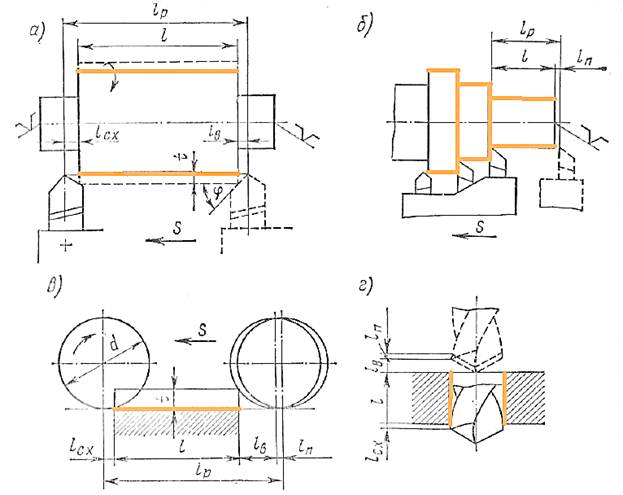 Рис. 1.3. Схемы определения расчетной длины обработки для случая а - продольного точения; б – при обработке на много резцовом токарном автомате; в – при продольном фрезеровании; г – при сверлении.
