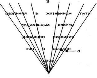 Таким образом выделяется несколько демаркационных линий, условно разграничивающих сферу индивидуальности, определяя ту или иную индивидуальную характеристику через принадлежность субъекта к группе — "Я" как представитель определенной расы и национальности (этот уровень группового статуса характеризуется высокой степенью дифференцированности Dk и, соответственно> узким S), "Я" как мужчина или женщина, ребенок, подросток или взрослый, имеющий или не имеющий отклонения от условной нормы (в физическом, психическом или личностном развитии) и т.д. Можно проследить влияние выделенной нами ранее парадигмальной конструкции на групповой статус. Так, критерии расы, пола и возраста соответствуют биологическому уровню (организм), различия в психическом развитии — индивидному, социокультурные, классовые особенности сильнее всего проявляются на уровне личности, наконец, различия