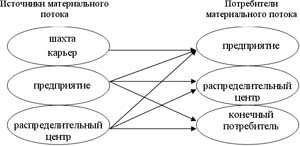 Материальный поток исходит либо из источника сырья, либо из производства, либо из распределительного центра. Поступает либо на производство, либо в распределительный центр, либо конечному потребителю (рис. 7).