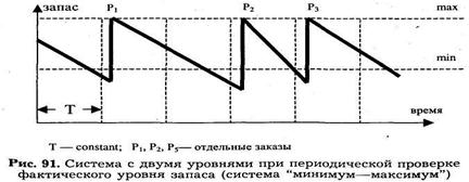 Система с двумя уровнями при периодической проверке фактического уровня запаса (с пороговым уровнем запаса). Фактический уровень товарных запасов проверяется через равные промежутки времени. Если он оказывается меньше минимального или равен ему, то принимается решение заказывать партию, равную разности максимального товарного запаса и фактического запаса на момент проверки с увеличением на ожидаемую реализацию за время выполнения заказа. Если фактический товарный запас больше минимального, то принимается решение "не заказывать" (рис. 91).