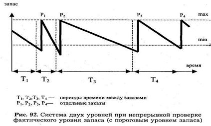 Система с двумя уровнями при непрерывной проверке фактического уровня запаса (с пороговым уровнем запаса). Решение заказать партию принимается при достижении порогового запаса. Размер заказываемой партии принимается равным разности максимального товарного запаса и порогового уровня, с увеличением на ожидаемую реализацию за время выполнения заказа (рис. 92).