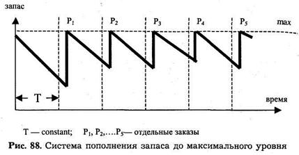 26/ Система пополнения запаса до максимального уровня. При этом через равные промежутки времени заказывается партия, объем которой, т. е. число единиц товара, равен разности установленного максимального уровня запасов и фактического уровня запасов на момент проверки. Размер заказа увеличивается на величину запаса, который будет реализован за период выполнения заказа (рис. 88).