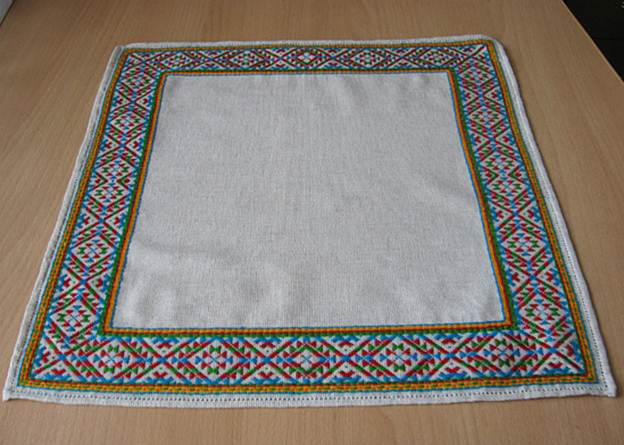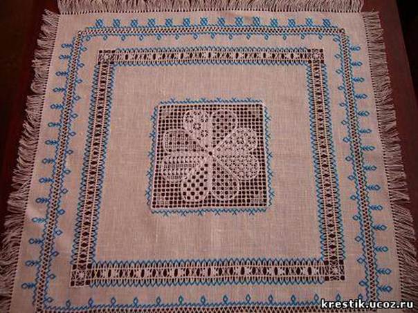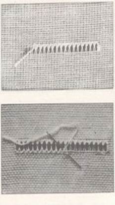 | 1. | Первый раз вышиваем справа налево. Из ткани вытягиваем 3—4 нитки для узкой строчки; для широкой нужно вытянуть больше ниток. Срезанные нитки закрепляем качалочкой. |