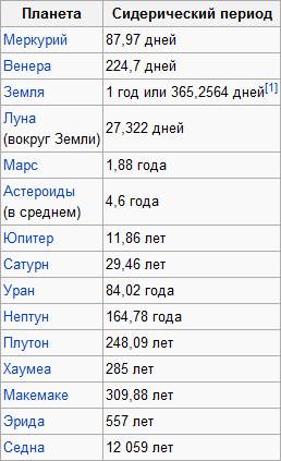 Сидерические периоды обращения планет Солнечной системы: