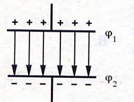 Так как поле сосредоточено внутри конденсатора, то линии напряженности начинаются на одной обкладке и кончаются на другой, поэтому свободные заряды, которые возникают на разных обкладках, равны по модулю и противоположны по знаку. Под емкостью конденсатора понимается физическая величина, равная отношению заряда Q, накопленного в конденсаторе, к разности потенциалов (φ1 — φ2) между его обкладками