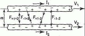 Взаимодействие токов — приходящая на единицу длины каждого каждого из параллельных проводников, пропорциональна величинам токов и обратно пропорциональна расстоянию между ними.