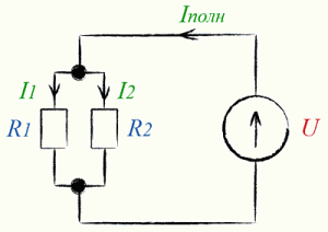 На нашем рисунке два узла, следовательно уравнений будет всего одно. Суммарный ток мы определим, используя первый закон Кирхгофа: