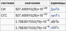 Таблица значений Магнетона Бора в зависимости от размерности:
