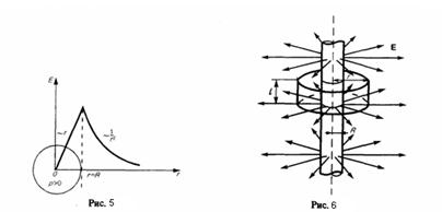 Если r<R, то замкнутая поверхность внутри зарядов не содержит, поэтому в этой области E=0. Значит, напряженность поля вне равномерно заряженного бесконечного цилиндра задается выражением (5), внутри же его поле равно нулю.