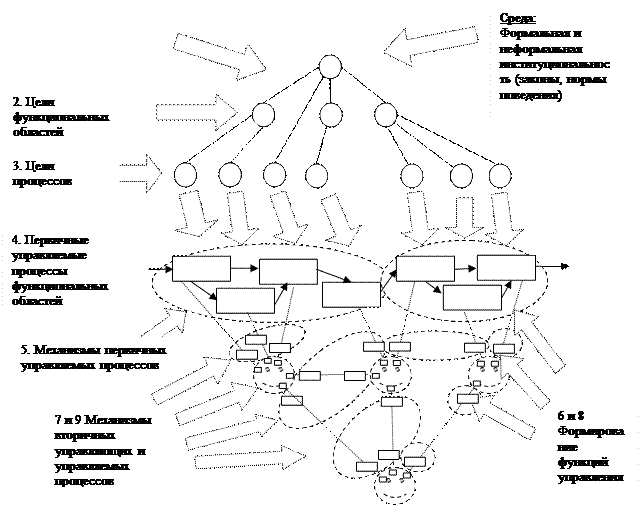 2. Определяющим моментом для конкурентоспособного существования системы является результат целеполагания функциональных областей. На этом этапе можно, структурировать деятельность организации, например, с позиций реинжиниринга бизнес-процессов (максимальная ориентация на клиентов, большой объем делегируемых полномочий командам процессов и т.д.). А также максимально учесть необходимый уровень управления фоновыми воздействиями на первичные процессы.