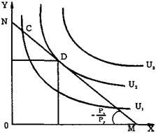 Двигаясь вдоль бюджетного ограничения, мы можем найти такую точку D, которая принадлежит кривой безразличия U2 более высокого порядка и в которой максимизируется благосостояние потребителя при данном бюджете. Кривая U3 является кривой более высокого порядка, чем U2, однако она выходит за пределы нашего бюджета и поэтому пока для нас недостижима.
