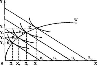 С ростом реального дохода бюджетное ограничение сдвигается последовательно в положение В, В2, В3,..., Вn. Точки касания кривых безразличия с бюджетными ограничениями К1 К2, К3, К4,..., Кn показывают последовательные положения равновесия потребителя в соответствии с ростом его дохода (рис. 12). Эта кривая, названная Дж. Хиксом "доход—потребление", в американской литературе получила название кривой уровня жизни.