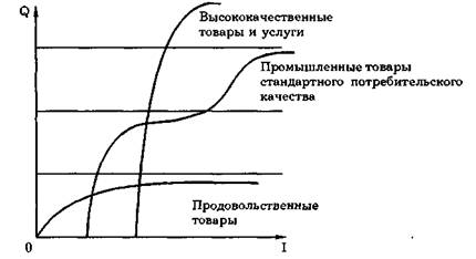 Уже в XIX в. было замечено, что с ростом реального дохода потребителя потребление вторичных благ возрастает быстрее, чем благ первой необходимости. Первым исследователем, занимавшимся вопросами влияния изменения дохода на структуру потребительских расходов, был немецкий статистик Эрнст Энгель(1821 — 1896). Кривые Энгеля в современной интерпретации представлены на рис. 13. Отложим на оси абсцисс доход потребителя I, а на оси ординат — количество оплачиваемых им продуктов Q. Прежде всего происходит насыщение продовольственными товарами, затем — промышленными товарами стандартного качества и лишь позднее — высококачественными товарами и услугами. Отмечена любопытная закономерность: даже после перехода к потреблению высококачественных товаров и услуг происходит новый всплеск спроса на промышленные товары стандартного качества, которые используются потребителем для повседневных нужд.