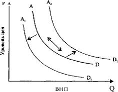 Модель совокупного спроса представлена в виде кривой, которая характеризует зависимость между объемом покупаемого реального ВНП и уровнем цен (рис. 14.1).