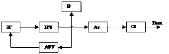 Задающий генератор (ЗГ) вырабатывает напряжение синусоидальной формы требуемой частоты. Это напряжение усиливается усилителем и подается на аттенюатор (Ат). Система автоматической регулировки уровня (АРУ) стабилизирует данный уровень выходного сигнала при изменении частоты. По вольтметру мы отслеживаем его значения. Это напряжение Ат ослабляется и через согласующий трансформатор (СТ) подается потребителю.