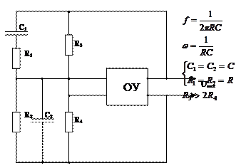 RC – генераторы. Данный генератор используется в самых простых и дешевых приборах. Коэффициент гармоник достигает 2%. Данный генератор представляет собой резистивный усилитель, охваченный частотно-зависящими обратными связями. Переход от одного поддиапазона к другому осуществляется переключением конденсаторов, а плавное изменение в приделах одного поддиапазона – изменением сопротивления резистора.