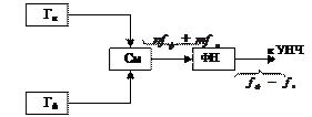 Задающий генератор содержит два LC генератора высокой частоты. Один из них вырабатывает напряжение фиксированной частоты, а второй напряжение, частоту которого можно плавно перестраивать. Сигналы с этих генераторов поступают на смеситель (См), где они смешиваются, образуя набор комбинационных частот, в том числе и напряжение разностной частоты. Эта смесь частот поступает на фильтр нижних частот (ФНЧ), который выделяет из этой смеси часто только напряжение разностной частоты, которое далее передаются на усилитель низкой частоты (УНЧ).Частота генераторов фиксированной и перестраиваемой частот определяется по соотношению: