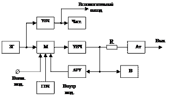 Задающий генератор определяет все частотные параметры генератора. Для контроля его работы используют вспомогательный канал (усилитель высокой частоты (УВЧ) и частомер). Сигнал с задающего генератора далее поступает на модулятор (М). Модулятор определяет режим амплитудной модуляции. В данном генераторе возможны два режима амплитудной модуляции: