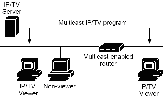 В отличие от unicast трафика, multicast адреса не могут быть назначены индивидуальным компьютерам (или STB). Когда данные посылаются по одному из multicast IP-адресов, потенциальный приемник данных может принять решение принимать или не принимать их, то есть будет абонент смотреть этот канал или нет. Такой способ передачи означает, что головное оборудование IPTV оператора будет передавать один единственный поток данных по многим адресам назначения. В отличие от случая broadcast передачи, за абонентом остается выбор - принимать данные или нет.