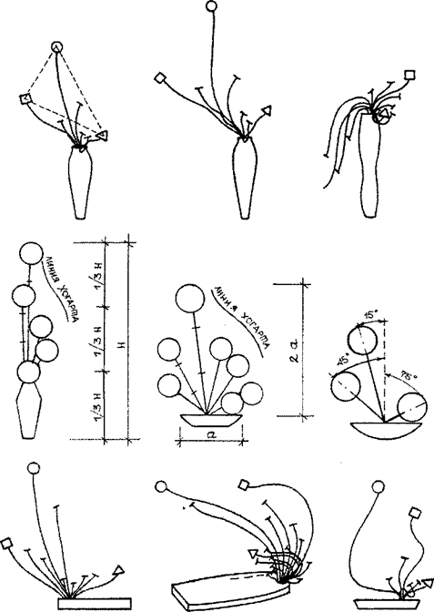 Рис. 12. Аранжировка букетов (икебана). Примеры построения вертикальных композиций (свободного стиля, наклонного стиля) в высоких и низких вазах.