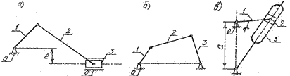 Кривошип – вращающееся звено, которое может совершать полный оборот вокруг неподвижной оси (звено 1 на всех трех схемах рис.12.5). Шатун – звено, которое образует кинематические пары только с подвижными звеньями (звено 2 на рис.12.5). Ползун – звено, образующее поступательную пару со стойкой (звено 3 на рис.12.5). Коромысло – вращающееся звено, которое может совершать только неполный оборот вокруг неподвижной оси (звено 3 на рис.12.5). Кулиса – звено, вращающееся вокруг неподвижной оси и образующее с другим подвижным звеном поступательную пару (звено 3 на рис. 12.5).