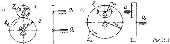 Для цилиндрической передачи знак "плюс" соответствует внутреннему зацеплению (рис. 15.1 б), а "минус" – внешнему (рис. 15.1 а).
