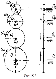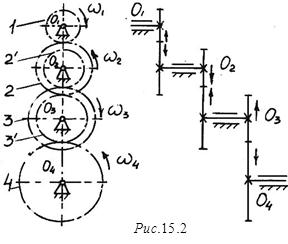 Многоступенчатый зубчатый механизм можно образовать последовательным соединением колес (рис. 15.2), при котором вращение от ведущего вала О1 передается ведомому валу О4 через промежуточные валы О2 и O3, на каждом из которых помещено по два колеса 2 и 2´, 3 и 3´. Колеса 2 и 2´ жестко соединены с валом O2 и имеют общую угловую скорость