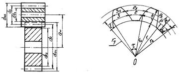 Рассмотрим сечение цилиндрического зубчатого колеса с внешними зубьями плоскостью, перпендикулярной к оси колеса (главное, или торцовое сечение). Выделяют окружность вершин зубьев (