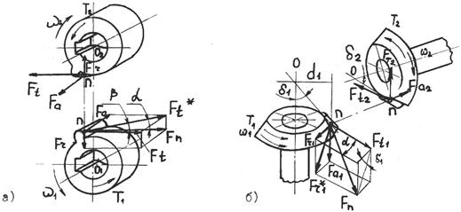 Рис. 21.7. Усилия в зацеплениях косозубых (а) и конических (6) колес