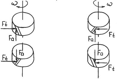Направление окружной и радиальной сил такое же, как и в прямозубой передаче. Осевая сила параллельна оси колеса, а направление вектора зависит от направления вращения колеса и направления линии зуба (рис.21.8)