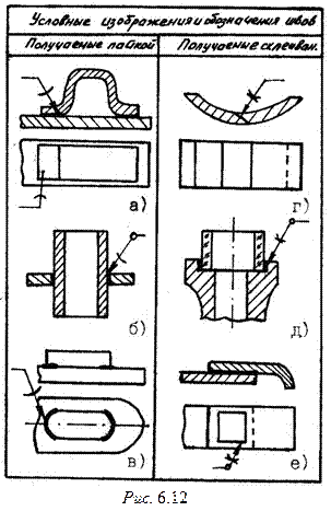 Припой или клей в разрезах (рис. 26.12 а, б, г, д, е) и на видах (рис.26.12 в)изображают линией в 2 раза толще основной сплошной линии. Для обозначения пайки (рис. 26.12 а, б и в) или склеивания (рис. 26.12 г, д и е) применяют условные знаки, которые наносят на линии-выноске от сплошной основной линии. Швы, выполненные пайкой или склеиванием по периметру, обозначаются линией-выноской, заканчивающейся окружностью диаметром 3-4 мм (рис. 26.12 б и д).