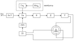 Сигнал с входного устройства (Вх.У) поступает на смеситель (См). Одновременно с ним на смеситель поступает сигнал с генератора качающейся частоты (ГКЧ). Сигнал с генератора качающейся частоты представляет собой синусоидальный сигнал, частота которого изменяется во времени по линейному закону. Этим перемещается спектр сигнала. Преобразованный смесителем сигнал подается на вход узкополосного фильтра (Ф). Когда смещаемая по частоте гармоника входного сигнала попадает в полосу пропускания узкополосного фильтра, в нем возникают колебания. Эти колебания поступают на детектор (Д). Детектор выделяет огибающую этих колебаний. Далее сигнал усиливается и поступает на вертикально отклоняющие пластины ЭЛТ. Управление частотой генератора качающейся частоты и отклонением луча ЭЛТ по горизонтали осуществляется одним и тем же пилообразным напряжением, поступающим от генератора развертки (ГР). Таким образом, горизонтальная ось на экране ЭЛТ является одновременно осью времени и осью частот. На экране ЭЛТ имеем изображение спектра: