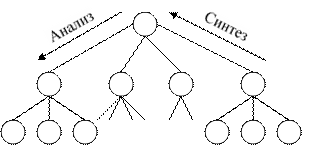 При структуризации системы следует пользоваться методами анализа и синтеза. Сначала один человек (группа) строит структуру системы (анализирует, определяет внутри-системную иерархичность), устраняет связи между компонентами и набор с названиями компонентов передает другому человеку (группе) для сборки системы (синтеза). Если результаты анализа и синтеза совпадут, т.е. после сборки системы не останется лишних компонентов, а система функционирует, то можно считать, что анализ и синтез выполнены правильно, структуризация системы проведена. Направления анализа и синтеза структуры системы показаны на рис. 3.4.