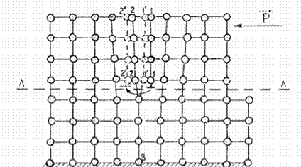 Рис. 1.2.8. Начальный этап эстафетного перемещения краевой дисло-кации (^): А-А – плоскость скольжения, 1-1 экстраплос-кость (исходная позиция)