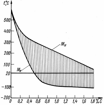Рис. 2.3.2. Влияние содержания уг-лерода на температуры начала (Мн) и конца (Мк) мартенситного пре-вращения